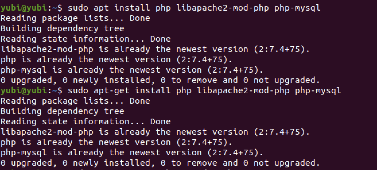 sudo apt-get install php libapache2-mod-php php-mysql