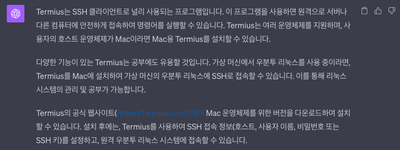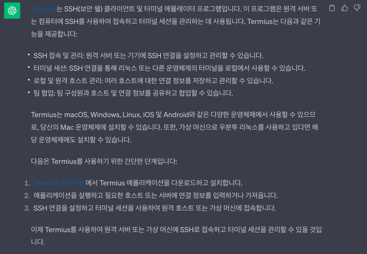 ChatGPT 3.5에게 터미널 프로그램(SSH)의 필요성과 사용하는 이유.. 그리고 가장 궁금했던 가상머신에 설치해야 하는지 로컬 운영체제에 설치해야 하는지 여부를 물어봤다.