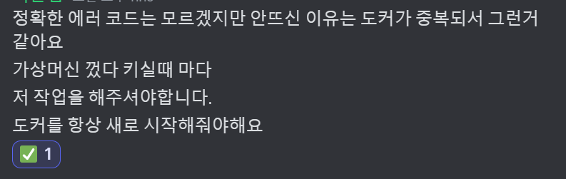 가상머신 껐다 킬 때마다 도커를 항상 새로 시작해줘야 한다고 한다.