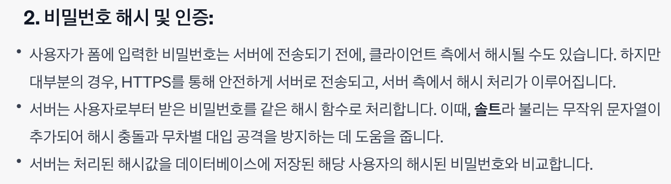 해시 함수 + 솔트 → SHA256("mysecurepassword" + "randomsalt123") → 해시 결과