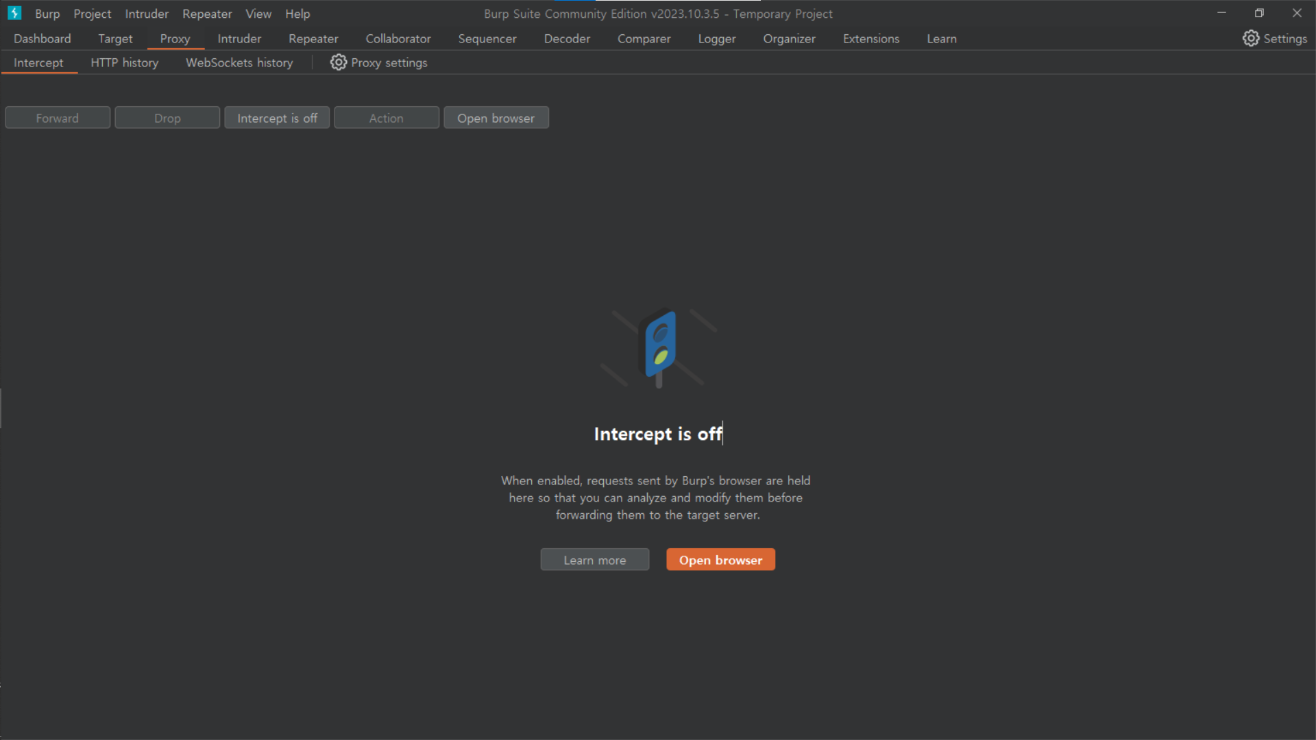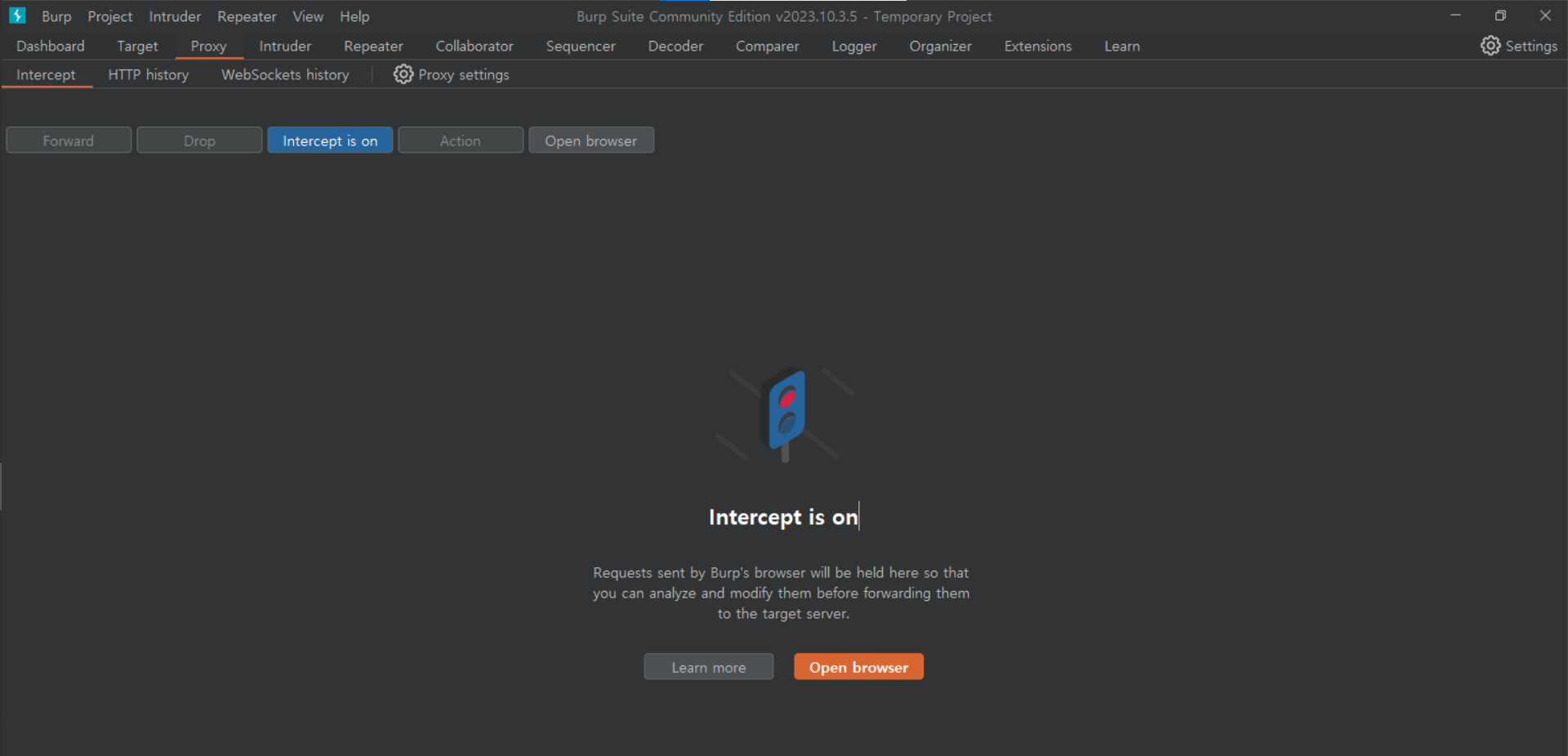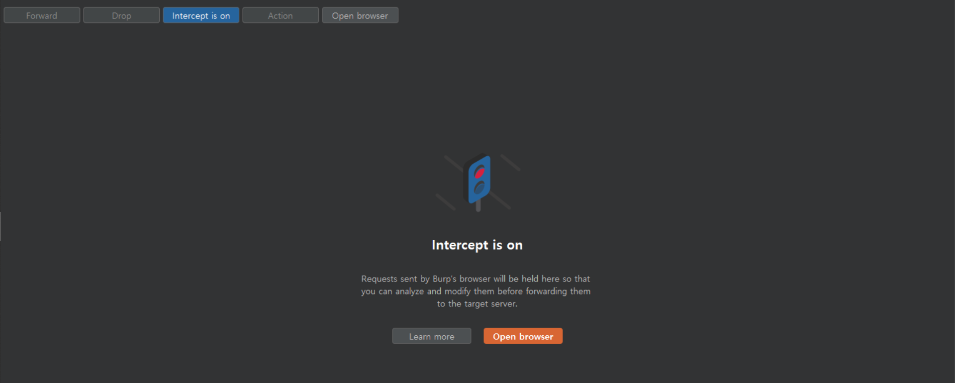 이제 여기서 [Intercept is off] 버튼을 누르게 되면 [Intercept is on]으로 변경되면서 기존 초록불 신호등 이미지가 빨간불 신호등으로 바뀐다.