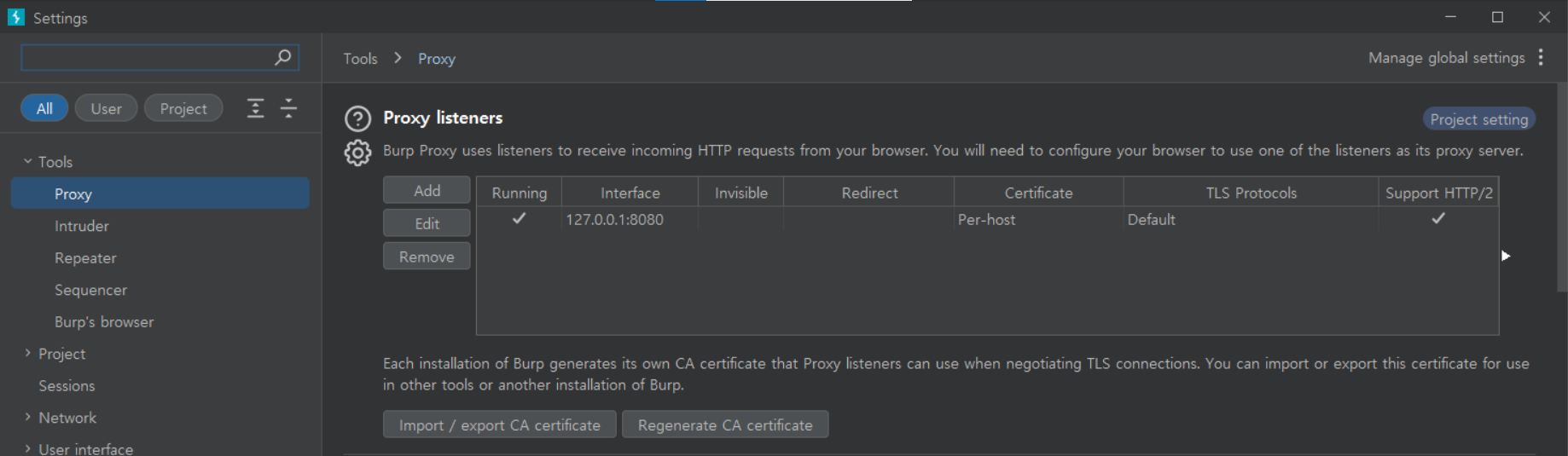 IP 주소 등을 설정하고, 프록시를 수동으로 가로챌 수 있게 허용해놓은 브라우저나 디바이스들을 연결해줄 수 있는 세팅인 것이다.