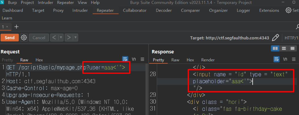 스크립트를 Request 에 넣어주고 send 하면 Response에서 잘 출력되는 것을 확인할 수 있다.