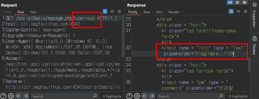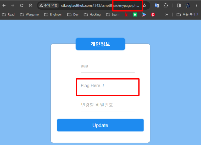 url을 보면 의도대로 mypage.php 에 잘 들어와졌고, 중간에 'Flag Here..!' 라는 무지하게 수상한 부분도 확인되었다.