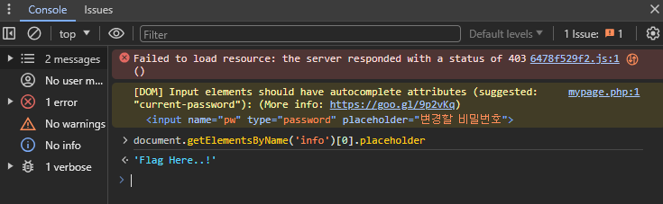 해당 코드를 console 창에 입력하면 Flag Here..! 결과가 나온다.