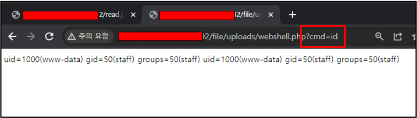 url 뒤에 + ' ?cmd=id ' 를 추가하여 GET method로 작성하고 실행하면 공격이 성공하여 원하는 값을 추출할 수 있다.